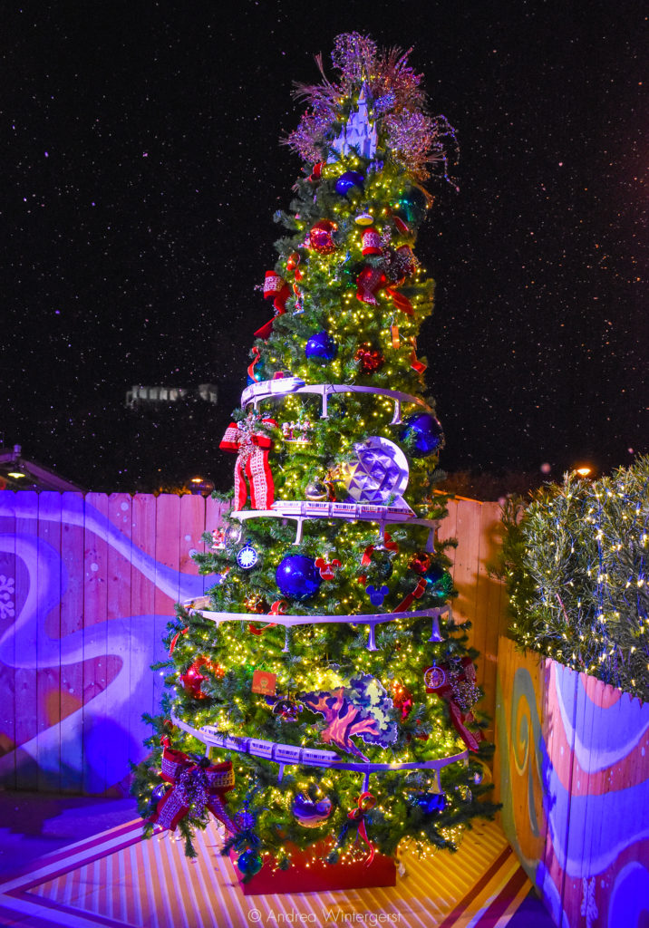 The trail is back for its fourth year in 2019 and joining the festivities are two new trees: Aladdin and The Lion King. Over twenty trees line the colorful, winding path. Halfway through the trail, you come to a little area on the right side where you can find snacks like gingerbread cookies, frozen hot chocolate and of course, Mickey Pretzels, and Santa’s Chalet on the left! Wait times can be up to two hours long since he’s super busy this time of year.