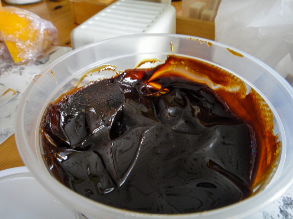 Lastly, there’s also a tub of sweet brown goop, Sirop de Poires et Pommes, lovingly made by hand in Thimister by the Siroperie Thomsin. And what is this syrup, you may ask? It’s a reduction of the juice obtained from pressing stewed apples and pears. Reducing it turns the juice into a sort of caramel that is then spread on bread or cheese, or in our case, both.