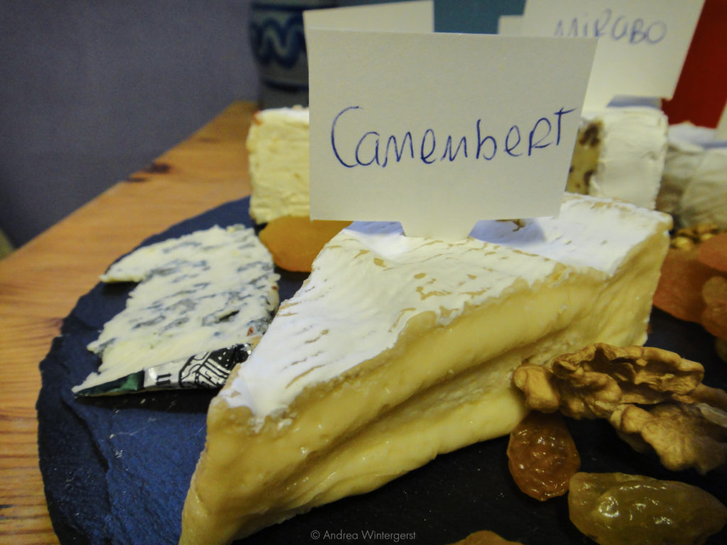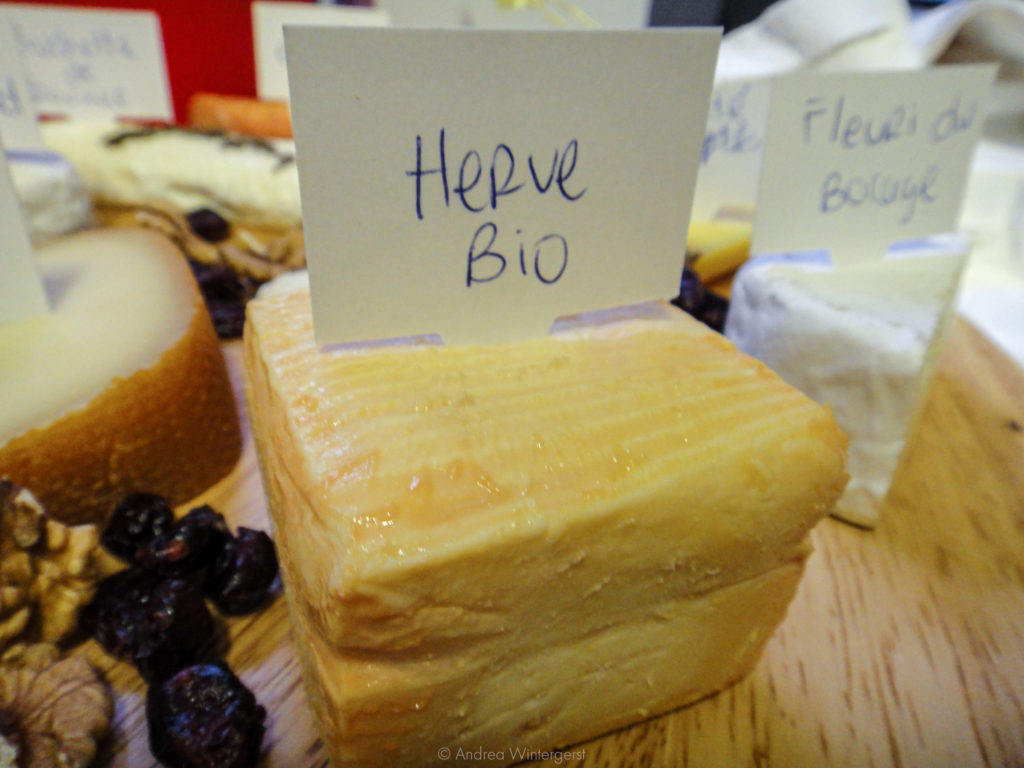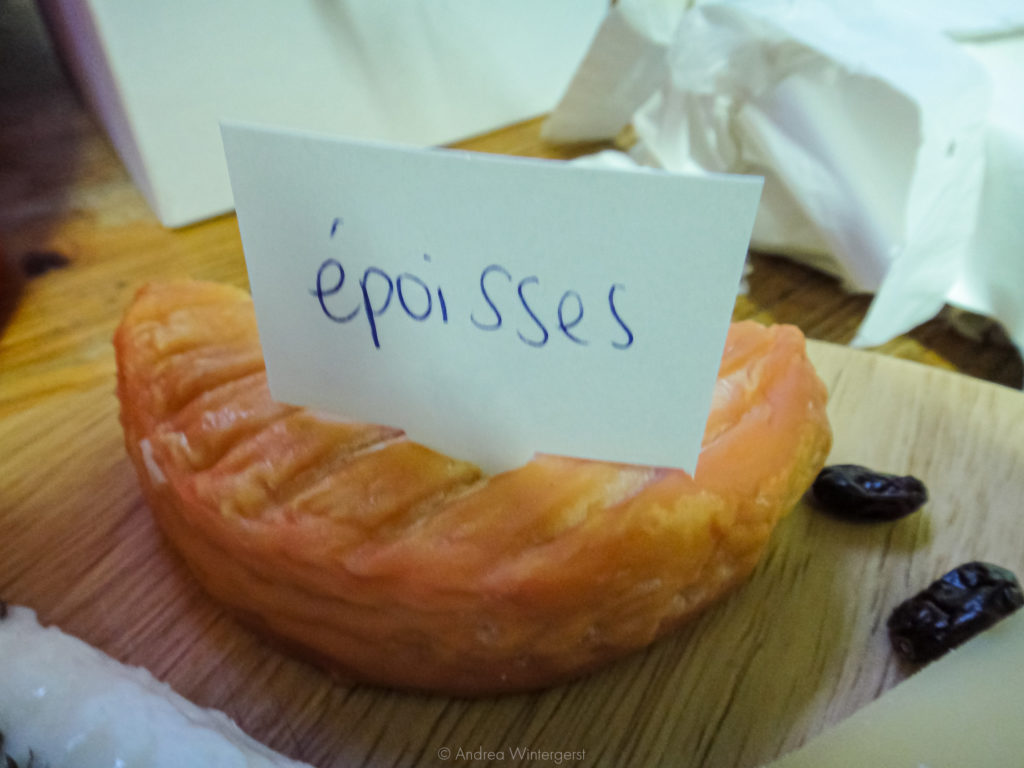 Last but most definitely not least, the stinkiest of them all and our raison d’être: Herve cheese. It’s a washed rind cheese, and if I thought Epoisses smelt strong, I hadn’t been paying enough attention to this little cube that looks like it packs a punch. I don’t think I’ll be fond of it.