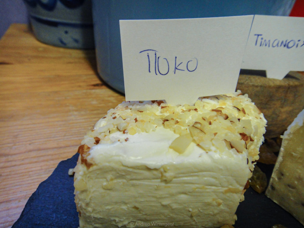A soft, fresh white cheese made from cow’s milk, covered in pineapple and almond pieces, Tolko could be a dessert all on its own. It is sweet, tangy, and milky. Finding more information on this cheese proved to be quite difficult, but by all accounts, it seems to be a creation of Danish brand Castello.