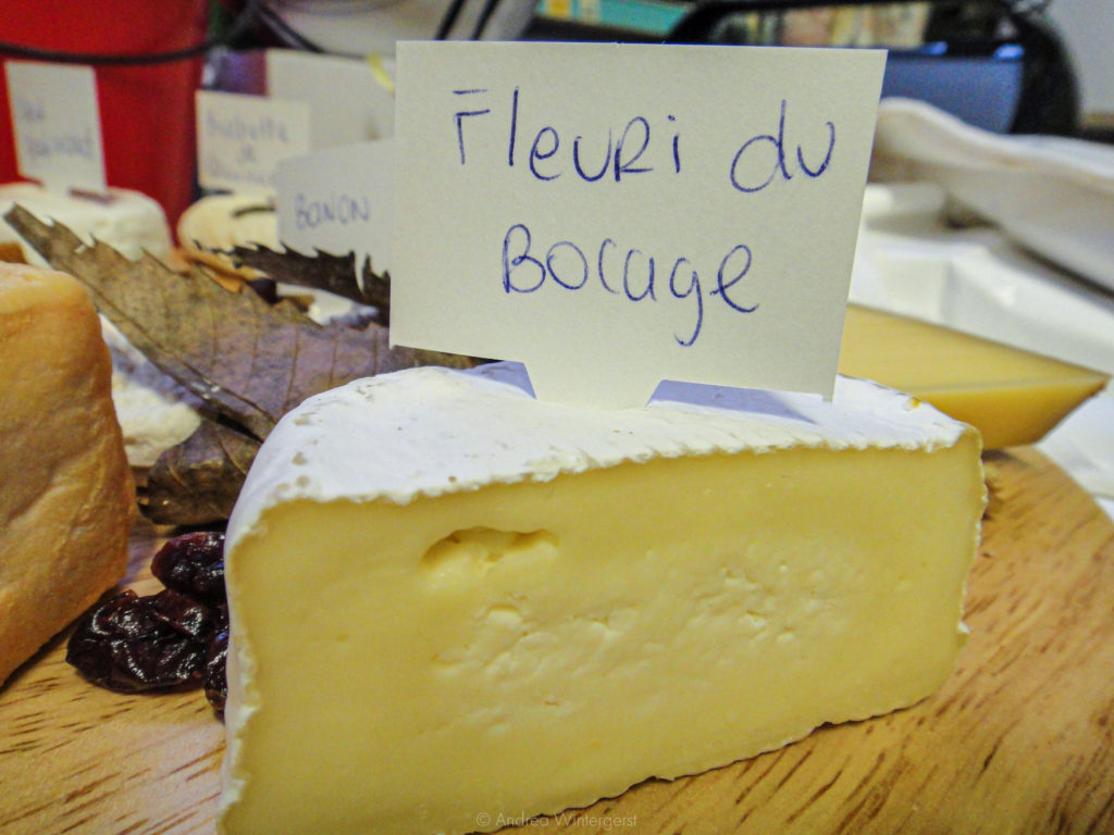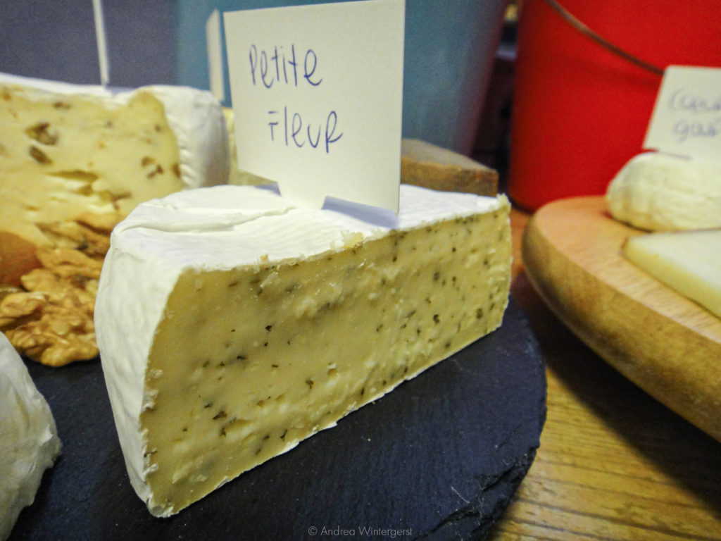 Petite Fleur is another bloomy rind cheese, made from raw cow’s milk. It’s quite soft and just a little salty. There is a plain version, but we went with the Aux Fines Herbes, which has chives, garlic, and parsley, a stark contrast to the previous flavors. Yum.