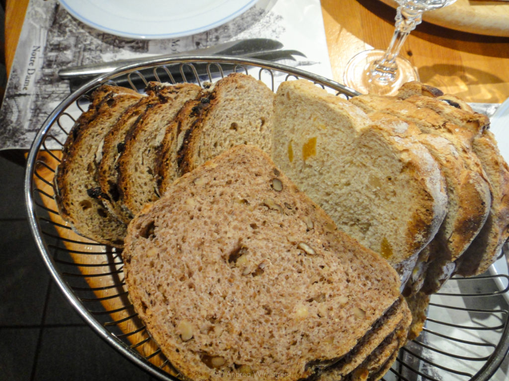 There’s also a basket of freshly baked bread, made in the same kitchen we are sitting in. Not content with making us a single loaf, they’ve prepared light rye, whole wheat studded with chopped pecans, and white sprinkled with dried apricots.