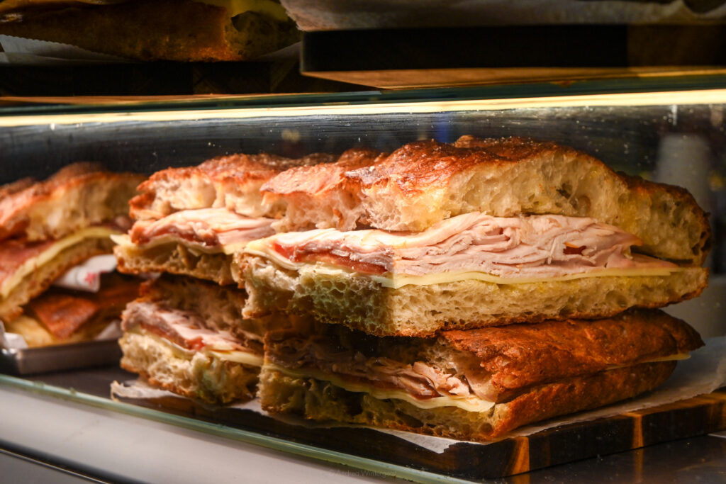 We stared at the sandwiches, haphazardly yet expertly stacked in the display case, while the guy behind the counter spread tomato sauce on the fresh dough.