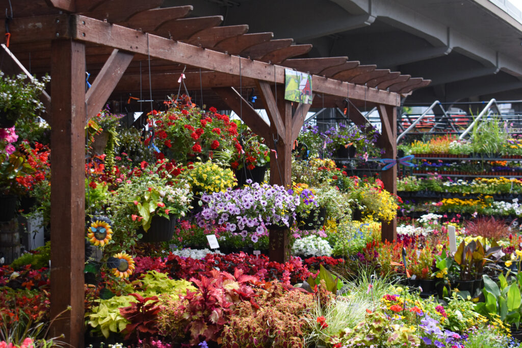 Stepping out from under the market roof and into the middle hall, flowers of all colors cover every surface.